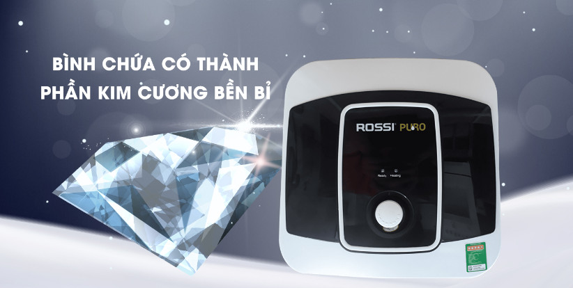 Bình tắm nóng lạng ROSSI PRO15SQ, ruột bình được tráng kim cương nhân tạo siêu bền vì vậy sản phẩm PURO15SQ được bảo hành lên đến 7 năm.