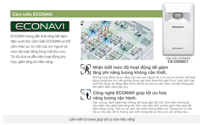 Dàn lạnh Panasonic FSV âm trần Cassette Mini S-45MY2E5A 2 chiều được tích hợp tính năng mắt thần Econavi mang đến khả năng tiết kiệm điện vượt trội. Cảm biến Econavi có thể cảm nhận được sự có mặt của con người và mức độ hoạt động trong mỗi khu vực. Từ đó đưa ra điều kiện hoạt động phù hợp, giảm lãng phí điện năng.. Đây cũng là một trong những dòng máy điều hòa Panasonic VRF có hiệu suất hoạt động cao và khả năng tiết kiệm không gian đặt máy.