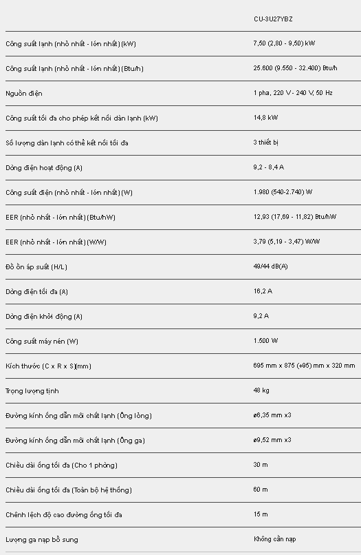 Dàn nóng Multi 1 chiều 27000 BTU Panasonic inverter CU-3U27YBZ của Panasonic sử dụng môi chất lạnh R32 thân thiện với môi trường cung cấp các giải pháp làm mát đa vùng linh hoạt chỉ với 1 dàn nóng. Kết nối tối đa 4 dàn lạnh, điều khiển dàn lạnh vận hành độc lập và nhiều lựa chọn kiểu dàn lạnh với đa dạng dải công suất.