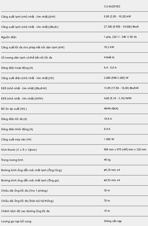 Dàn nóng Multi 1 chiều 28000 BTU Panasonic inverter CU-4U28YBZ sở hữu thiết kế nhỏ gọn và được tăng cường chiều dài đường ống, giúp khắc phục những hạn chế về không gian và lắp đặt. Kết hợp các dàn lạnh theo nhu cầu công suất và thiết kế trang trí của phòng. Cùng với những đặc điểm trên, dàn nóng này còn có những tính năng hiện đại,