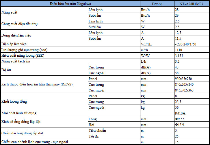 Điều hòa âm trần Nagakawa NT-A28R1M03 sử dụng môi chất lạnh tiên tiến gas R410a với ưu điểm: Hiệu suất làm lạnh cao tiết kiệm chi phí tiền điện hàng tháng, ngoài ra chỉ số tác động ảnh hưởng đến môi trường rất thấp.