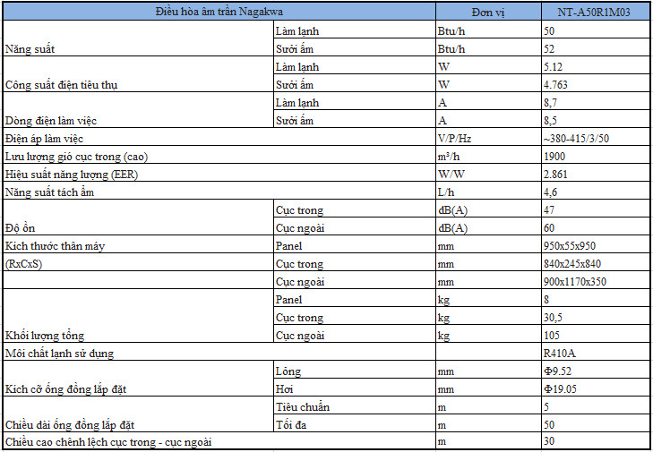 Điều hòa âm trần Nagakawa NT-A50R1M03 với ưu thế giá rẻ, thiết kế vuông vắn, khỏe khoắn, và khả năng hoạt động vô cùng mạnh mẽ, phù hợp lắp đặt trong những không gian lớn và không gian mở. Ở series này, điểm đặc biệt cần lưu tâm giá thành sản phẩm rẻ hơn rất nhiều so với các đối thủ khác cùng mức công suất.