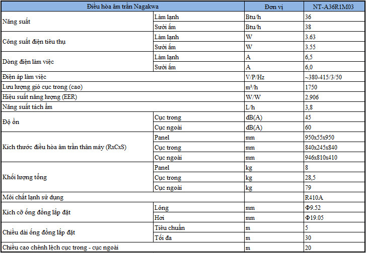 Điều hòa âm trần Nagakawa 2 chiều 36.000BTU NT-A36R1M03