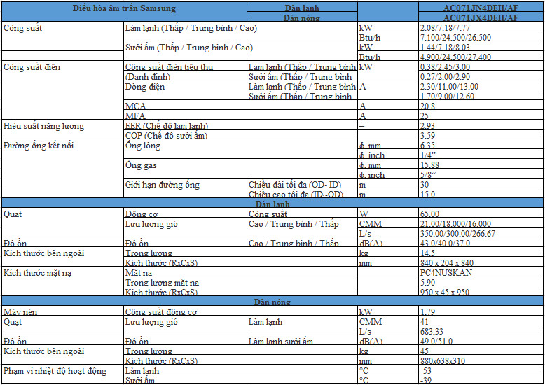 Samsung AC071JN4DEH/AF có công suất làm lạnh 26.500 Btu/h và công suất sưởi ấm 27,400 Btu/h (diện tích 40 m² hoặc 115 m³ khí) phù hợp lắp đặt máy lạnh ở phòng khách, phòng ngủ hay phòng bếp.