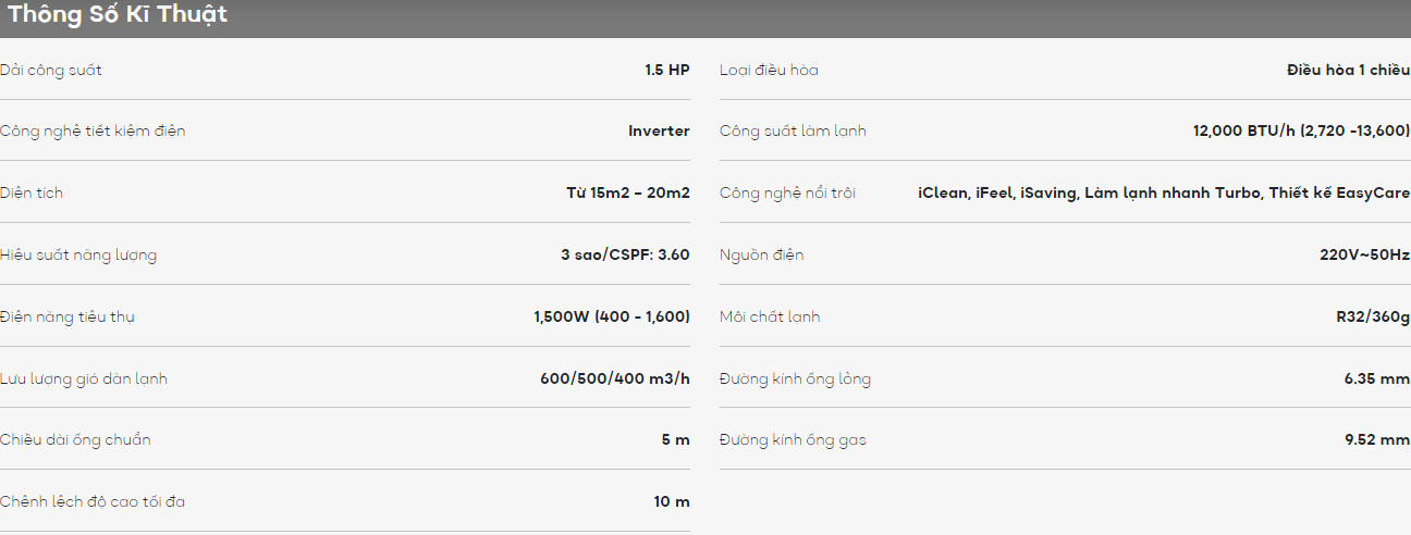 - Điều hòa Casper có công suất làm lạnh 1.5 HP - 12.000 BTU nên phù hợp với diện tích phòng dưới 20m² (từ 40 đến 60m³).