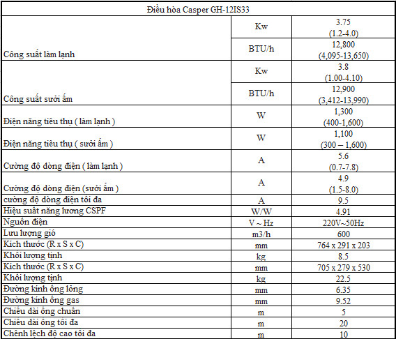 Điều hoà 2 chiều Casper GH-12IS33 inverter hoạt động với công suất 12000BTU, sử dụng hiệu quả nhất cho các căn phòng có diện tich từ 15-20m