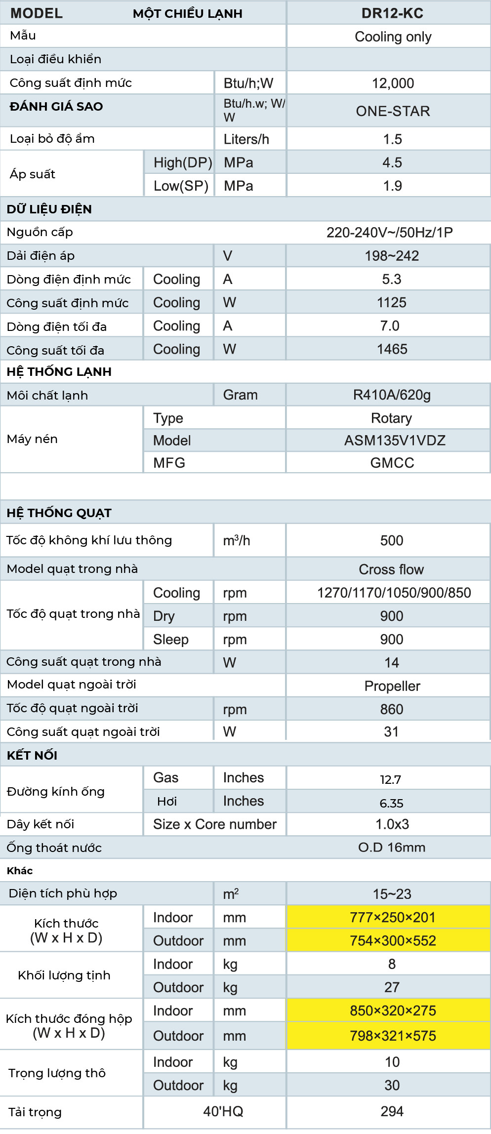 Điều hòa Dairry 12000BTU 1 chiều DR12-KC