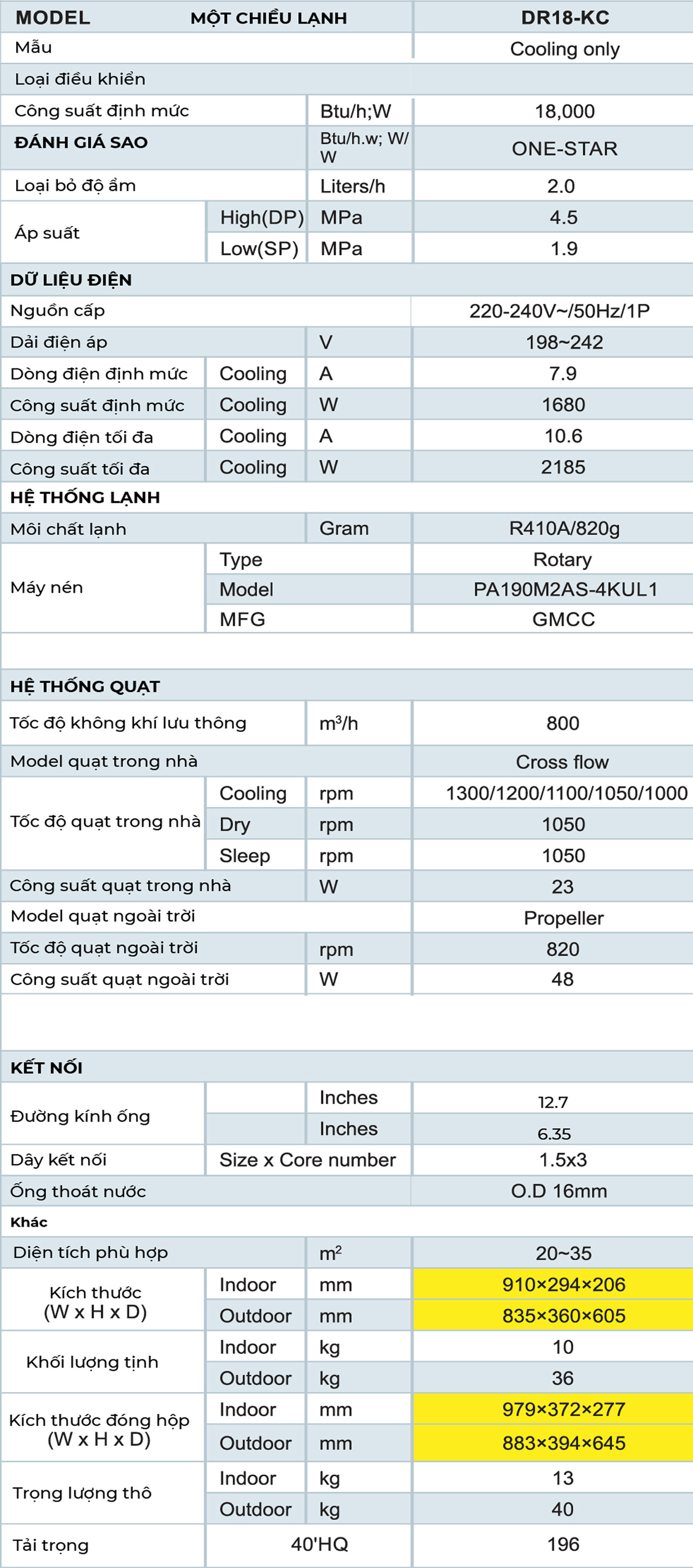 Điều hòa Dairry 18000BTU 1 chiều DR18-KC