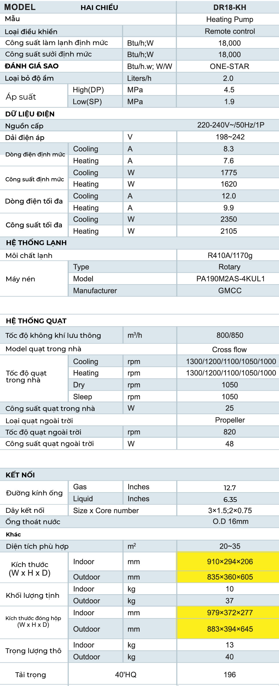 Điều hòa Dairry 18000BTU 2 chiều DR18-KH