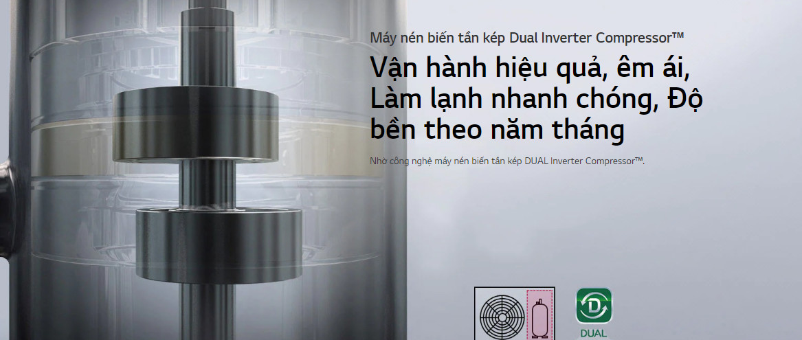 Máy nén kép Inverter liên tục điều chỉnh tốc độ của máy nén để duy trì mức nhiệt độ mong muốn. Hơn thế nữa, máy nén kép Dual Inverter Compressor™ với dải tần số hoạt động rộng hơn giúp tiết kiệm được nhiều hơn so với máy nén thông thường.
