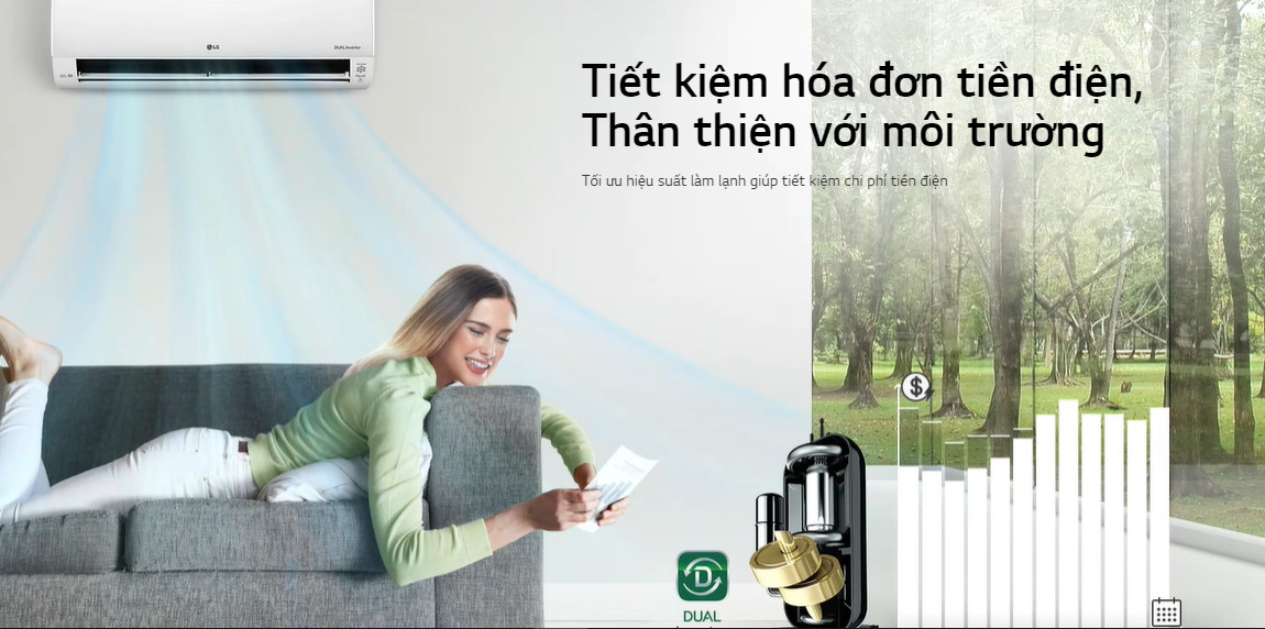 Máy điều hòa không khí LG vận hành với mức âm thanh thấp, nhờ có thiết kế quạt nghiêng độc đáo của LG và máy nén kép Dual Inverter Compressor™ giúp loại bỏ tiếng ồn không cần thiết và cho phép vận hành êm ái hơn.