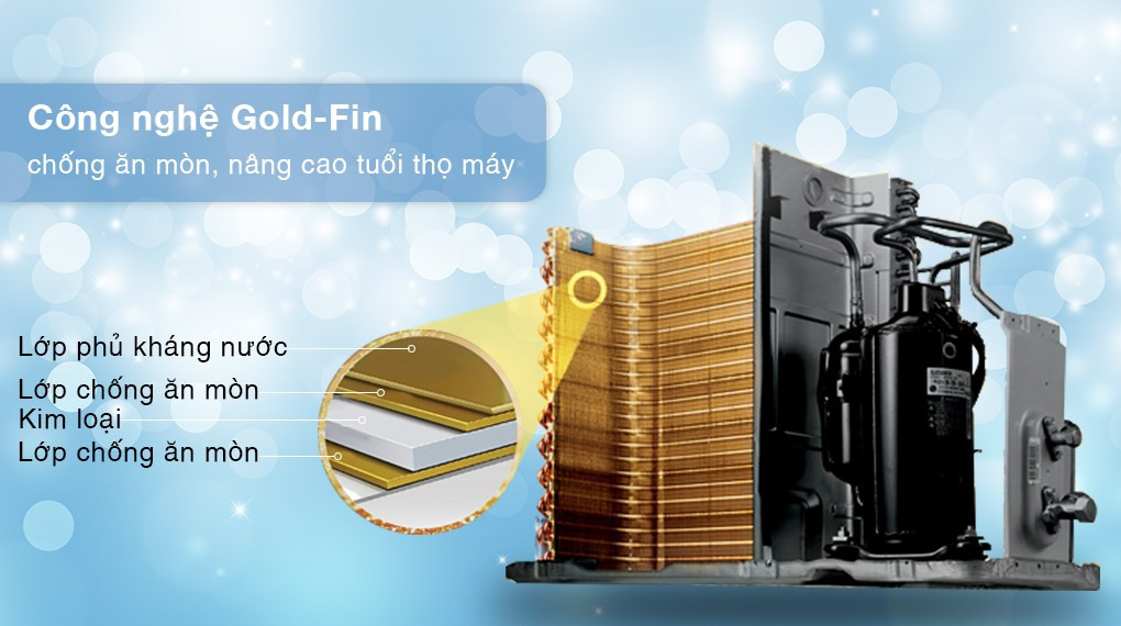 Điều hòa LG Inverter có dàn nóng dạng khối hình hộp chữ nhật, vỏ bằng thép chắc chắn, độ bền cao, ống dẫn gas bằng đồng và lá tản nhiệt bằng nhôm được phủ lớp Gold-Fin chống ăn mòn nên máy có độ bền cao, phù hợp cho những khu vực gần biển.