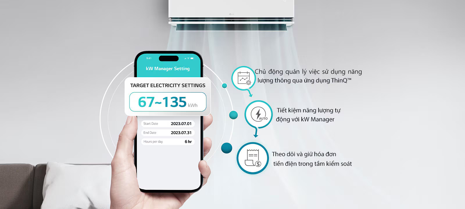 Bên cạnh đó, thông qua ứng dụng LG ThinQ, bạn có thể quyết định thời gian sử dụng và mức tiêu thụ năng lượng. Nếu vượt quá giới hạn sử dụng hàng ngày, lượng điện tiêu thụ trong các ngày còn lại sẽ tự động được tính toán lại cho bạn trong giới hạn đã chỉ định.