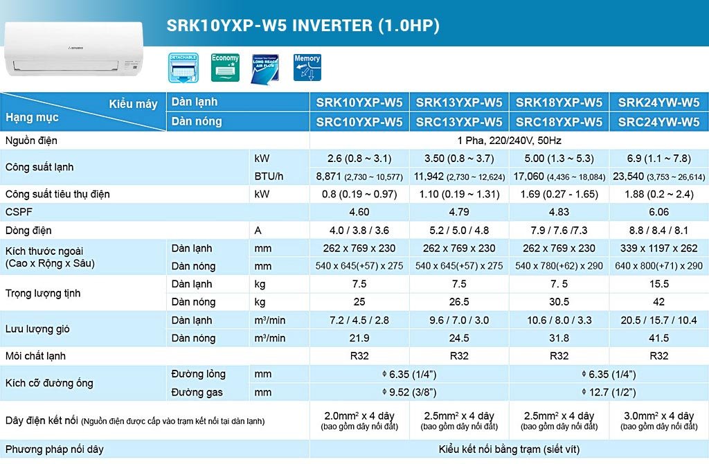 Hiện tại Mitsubishi Heavy dòng YXP-W5 có 3 dãy công suất từ 1 HP cho đến 2 HP, tương ứng với các mã số sau: SRK10YXP-W5 (1 HP), SRK13YXP-W5 (1.5 HP) và SRK18YXP-W5 (2 HP).