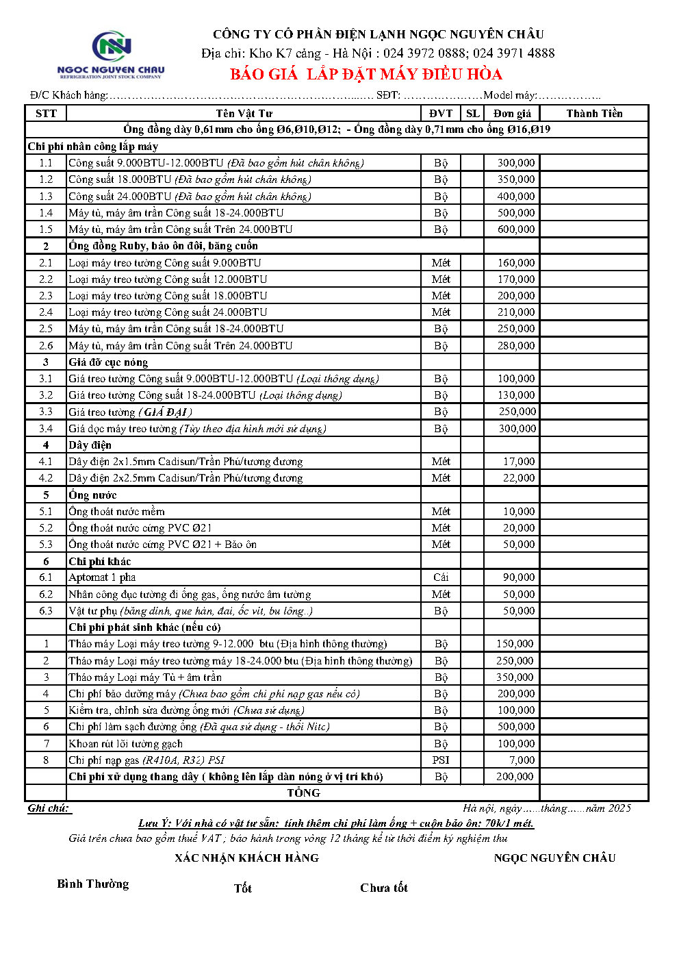 - Tổng tiền chi phí nhân công & vật tư lắp đặt phải thanh toán căn cứ theo biên bản khối lượng nghiệm thu thực tế;