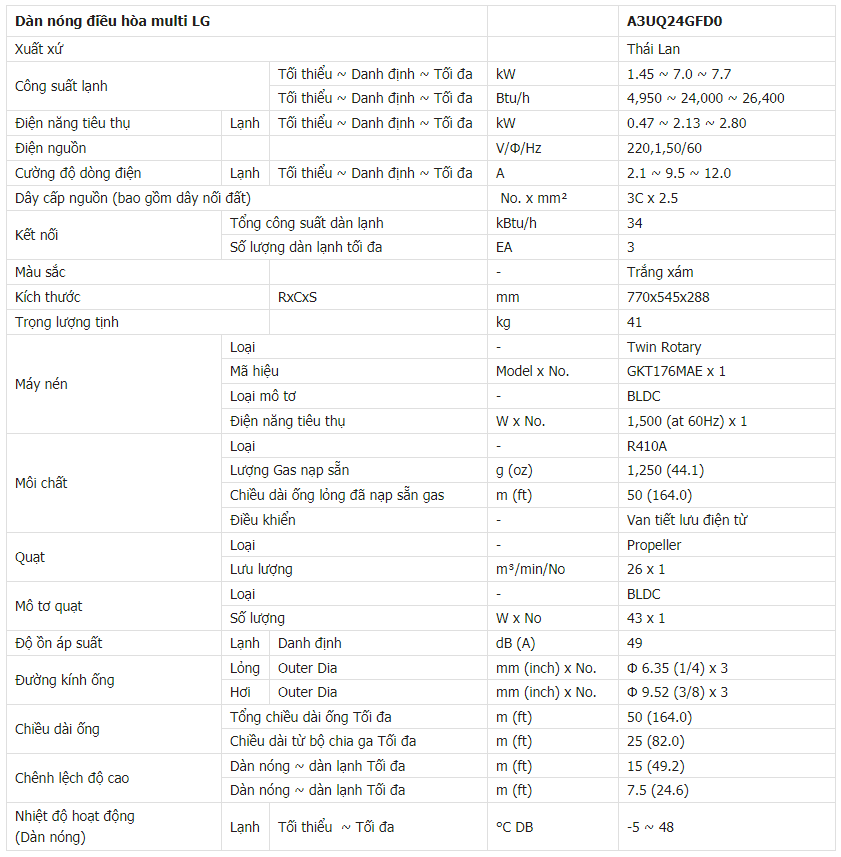 Dàn nóng điều hòa LG 24000BTU A3UQ24GFD0 kết nối được 3 giàn lạnh ( treo tường, âm trần, nối ống gió) A3UQ24GFD0 được nhập khẩu Thái Lan