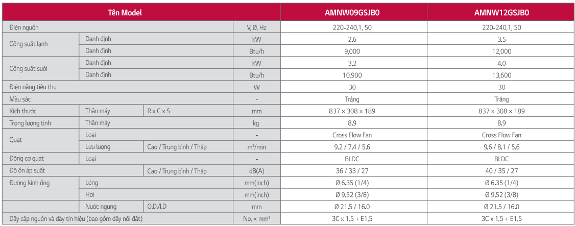 Công suất 9.000BTU, điều hòa multi LG AMNW09GSJB0 phù hợp lắp đặt cho phòng ngủ, phòng đọc sách...