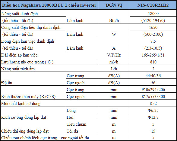 Với công suất 18000BTU, Nagakawa inverter NIS-C18R2H12 phù hợp lắp đặt cho phòng có diện tích khoảng 30m2 phòng khách cửa hàng, văn phòng... được rất nhiều khách hàng quan tâm lựa chọn.