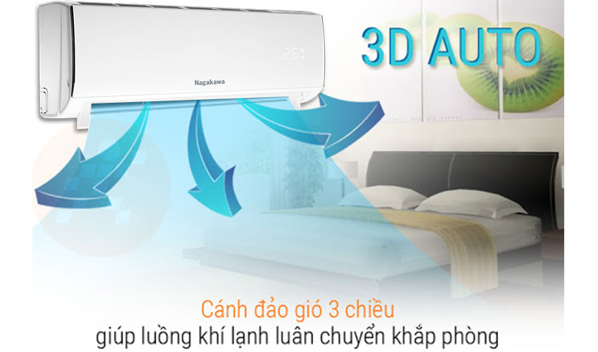 Công nghệ Đảo gió 3D-Auto tự động 4 hướng: lên/xuống/trái/phải, với cánh gió dọc và ngang giúp hơi lạnh/sưởi được phân phối đều khắp phòng, việc làm lạnh/sưởi sẽ dễ chịu hơn rất nhiều do gió sẽ ít bị thổi trực tiếp vào cơ thể.