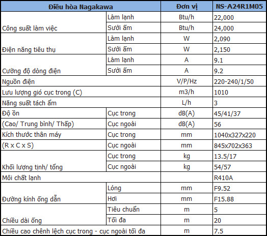 ĐIỀU HÒA NAGAKAWA 2 CHIỀU NS-A24R1M05 24000 BTU/H