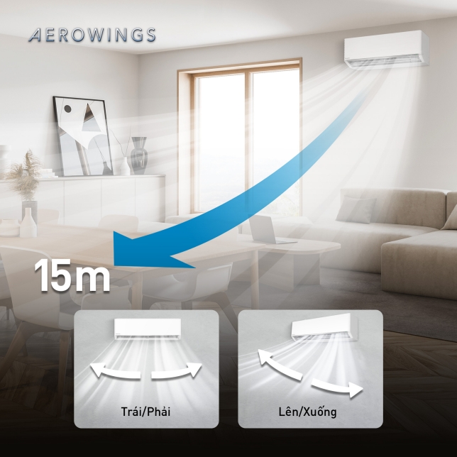 AEROWINGS mang lại khả năng làm mát nhanh chóng và hiệu quả với phạm vi làm mát lên đến 15 mét. Cánh đảo gió AEROWINGS có thể đảo gió tự động 4 chiều*, hoặc tùy chỉnh hướng gió sang trái và phải, lên và xuống để mang đến sự thoải mái tối ưu cho căn phòng.