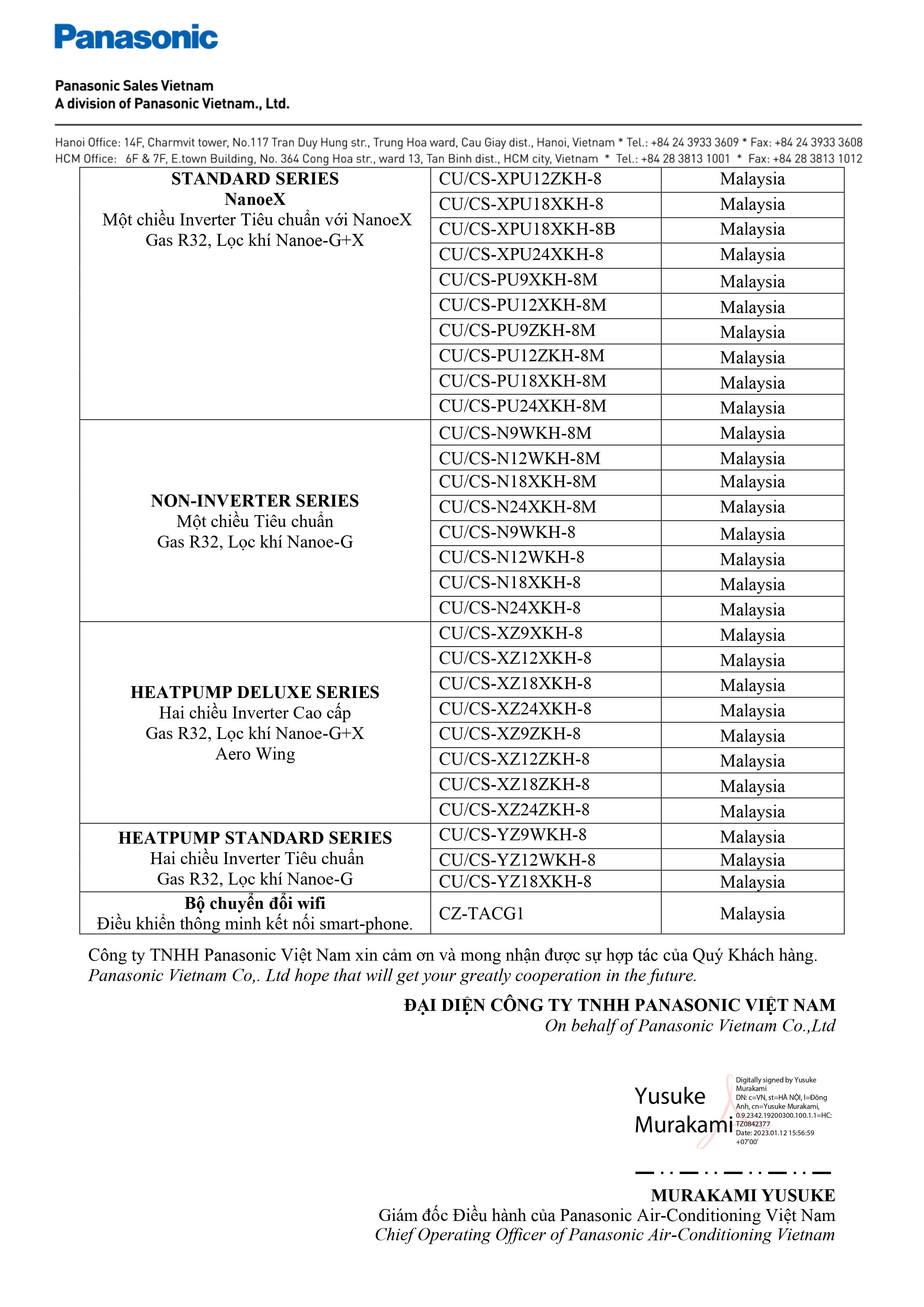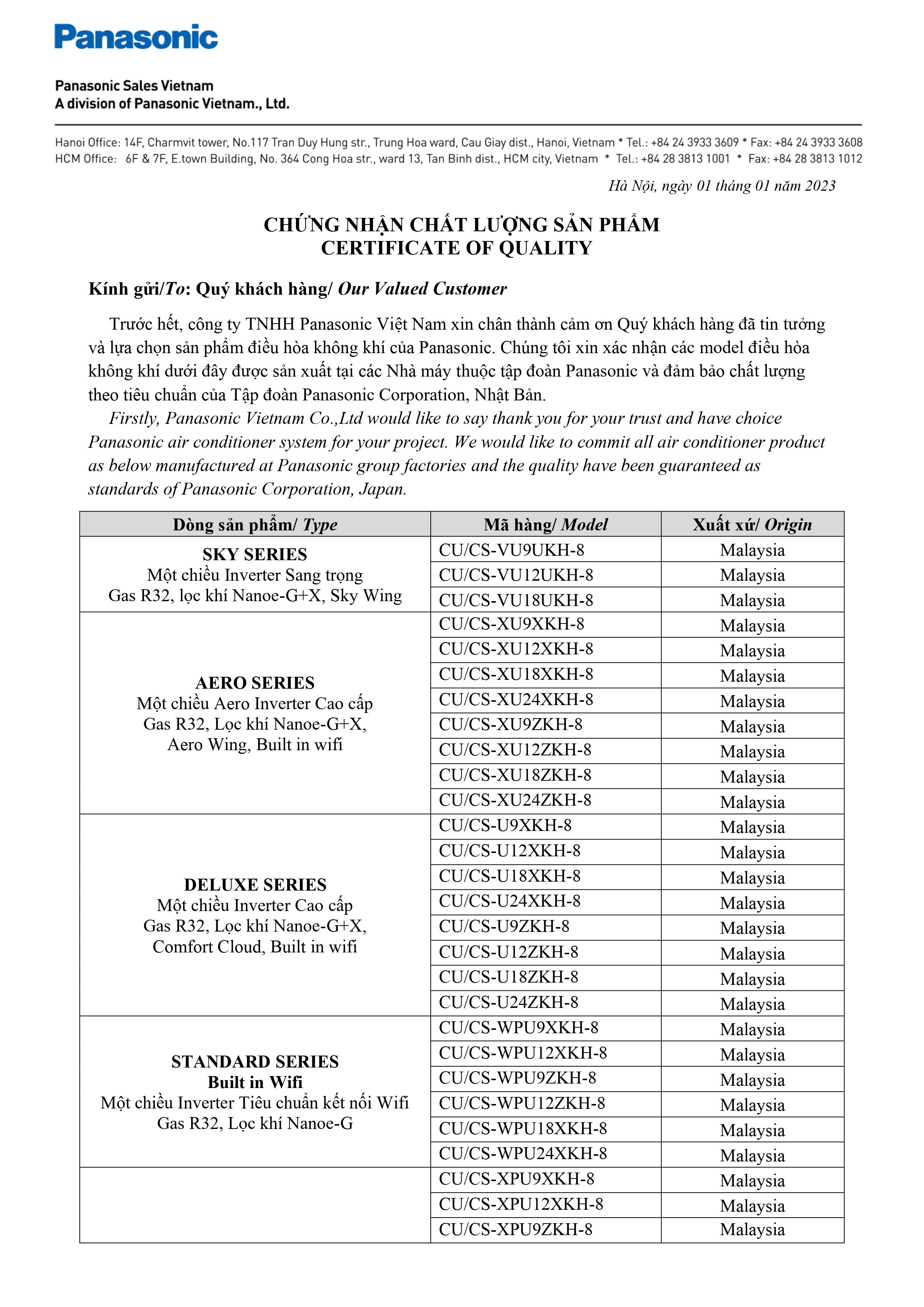 Panasonic N9ZKH-8 được sản xuất và nhập khẩu nguyên bộ từ Indonesia. Nhà máy tại Indonesia hiện tại chỉ sản xuất duy nhất dòng sản phẩm N series tiêu chuẩn của Panasonic còn các dòng sản phẩm treo tường khác vẫn được sản xuất tại nhà máy Malaysia.