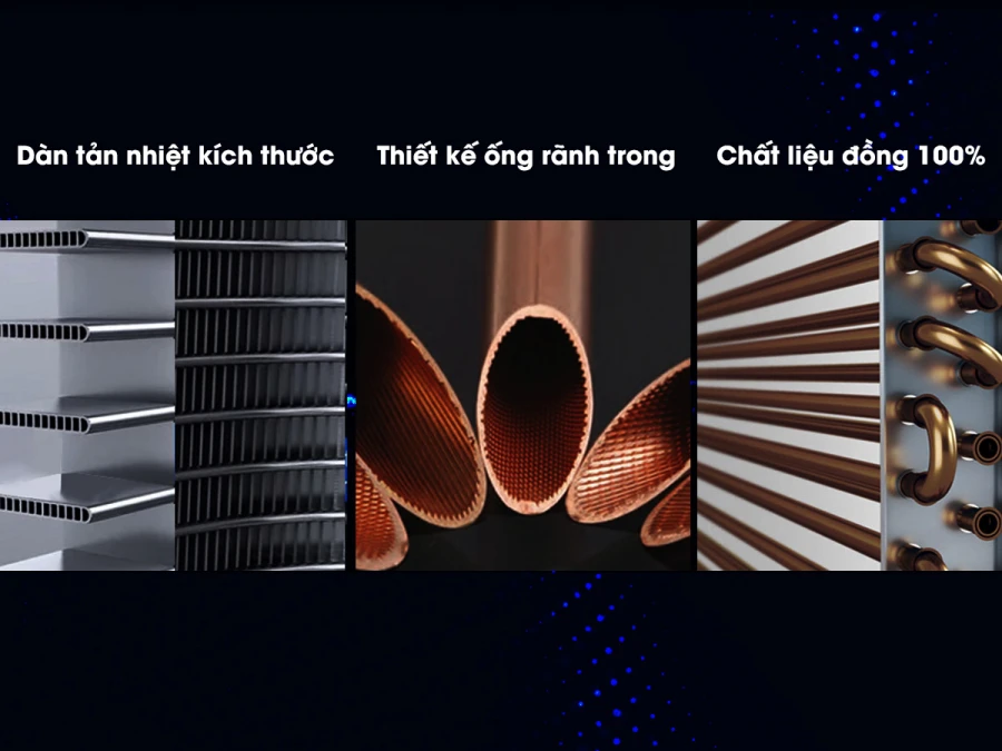 Dàn lạnh SK sở hữu đến 13 cặp ống đồng rãnh trong. Số lượng cặp ống cao hơn thể hiện tải lượng gas lạnh lớn hơn. Đồng thời, thiết kế rãnh trong gia tăng khả năng xáo trộn và diện tích mặt tiếp xúc môi chất, đẩy nhanh tốc độ trao đổi nhiệt với môi trường bên ngoài. Trong khi đó, chất liệu đồng nguyên chất cho khả năng chịu áp suất và nhiệt độ cao, làm chậm quá trình oxi hóa.