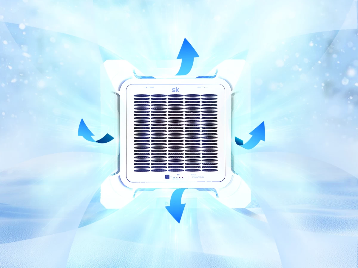 Khi kết hợp cùng cấu trúc dàn trao đổi nhiệt, điều hòa cassette SK tạo hơi lạnh dạng lốc xoáy, mạnh mẽ phủ đều 360 độ và cho sức lan tỏa rộng hơn, làm mát căn phòng nhanh chóng.