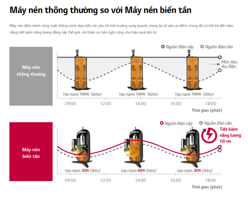 Máy nén điều chỉnh công suất thông minh dựa trên các yếu tố môi trường xung quanh, mang lại vô vàn ưu điểm, trong đó có thể kể đến hiệu năng tiết kiệm năng lượng đẳng cấp thế giới, cải thiện sự tiện nghi cũng như hiệu quả bền bỉ đảm bảo sản phẩm an toàn và bền lâu.