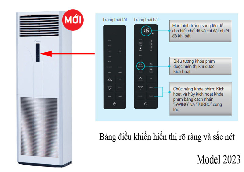 Bảng điều khiển màu đen sang trọng với đèn LED trắng cho hiển thị rõ ràng và sắc nét: Dàn lạnh của chiếc điều hòa tủ đứng Daikin này được tích hợp màn hình LED nên có thể dễ dàng quan sát nhiệt độ của máy ngay cả vào ban đêm.