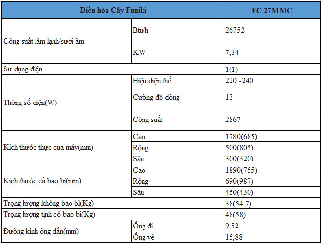 Máy điều hòa Funiki tủ đứng FC27MMC với công suất 27.000btu phù hợp lắp đặt với không gian có diện tích dưới 50m2. Với ưu điểm thiết kế nhỏ gọn, hoạt động mạnh mẽ, đem lại thẩm mỹ rất lớn cho không gian sống, chính vì vậy đã được rất nhiều văn phòng làm việc, nhà hàng hoặc khách sạn lựa chọn sử dụng.