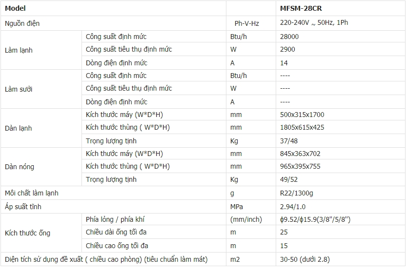 Điều hòa tủ đứng Midea MFSM-28CR có công suất làm lạnh 28000BTU phù hợp với căn phòng có diện tích từ 40m2 - 45m2.