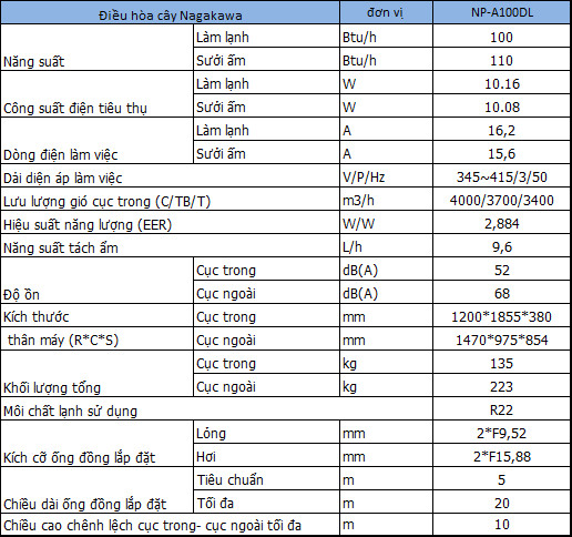 Với công suất điều hòa cây 100.000BTU, Nagakawa NP-A100DL phù hợp lắp đặt cho diện tích: 150-160m2, như Hội trường, Nhà Xưởng, Nhà máy, Khu Công nghiệp…