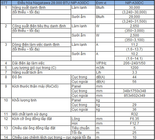 Kể từ năm 2018, Nagakawa không còn sản xuất tại nhà máy Việt Nam nữa mà toàn bộ điều hòa đã được nhập khẩu. Nagakawa NIP-A30DC được sản xuất và nhập khẩu nguyên bộ từ Malaysia với trình độ kỹ thuật chuyên môn cao, đáp ứng tốt nhất nhu cầu của người tiêu dùng Việt Nam. Toàn bộ quy trình sản xuất được kiểm soát bởi quy tắc khắt khe của Nagakawa.