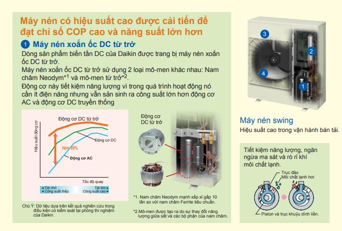 COP cao: Nhờ vào sự kết hợp của các công nghệ tiết kiệm năng lượng, COP của sản phẩm đạt được từ 3.00 đến 3.94.