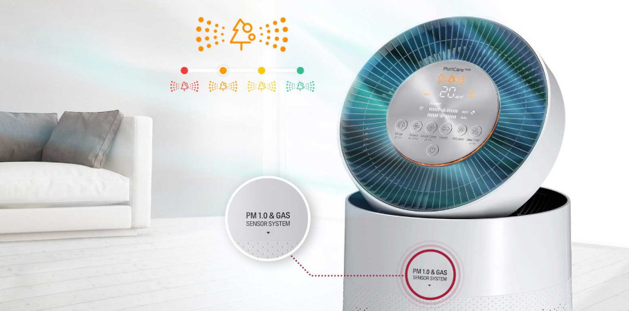 LG PuriCare cập nhật số đo về mức độ mùi và bụi trong nhà theo thời gian thực tế với cảm biến PM 1.0 dễ dàng theo dõi và nhận biết tình trạng không khí trong nhà với màn hình hiển thị chất lượng không khí theo màu sắc dựa trên hệ thống cảm biến PM 1.0.
